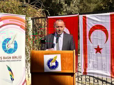 Konuşmasında Kıbrıs adasının tarihi süreçlerine Dış Basın Birliği’nin aktif katkılarını vurgulayan Canbaz, Kıbrıs sorunu, Doğu Akdeniz’deki gelişmeler ve yaklaşan Cumhurbaşkanlığı seçimlerine değindi.